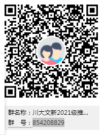 申请人请加入“川大文新2021级推免硕士”QQ群(群号:854208829, 也可扫描以下二维码进入),该群需实名认证,认证方式是“姓名+所在学校”。