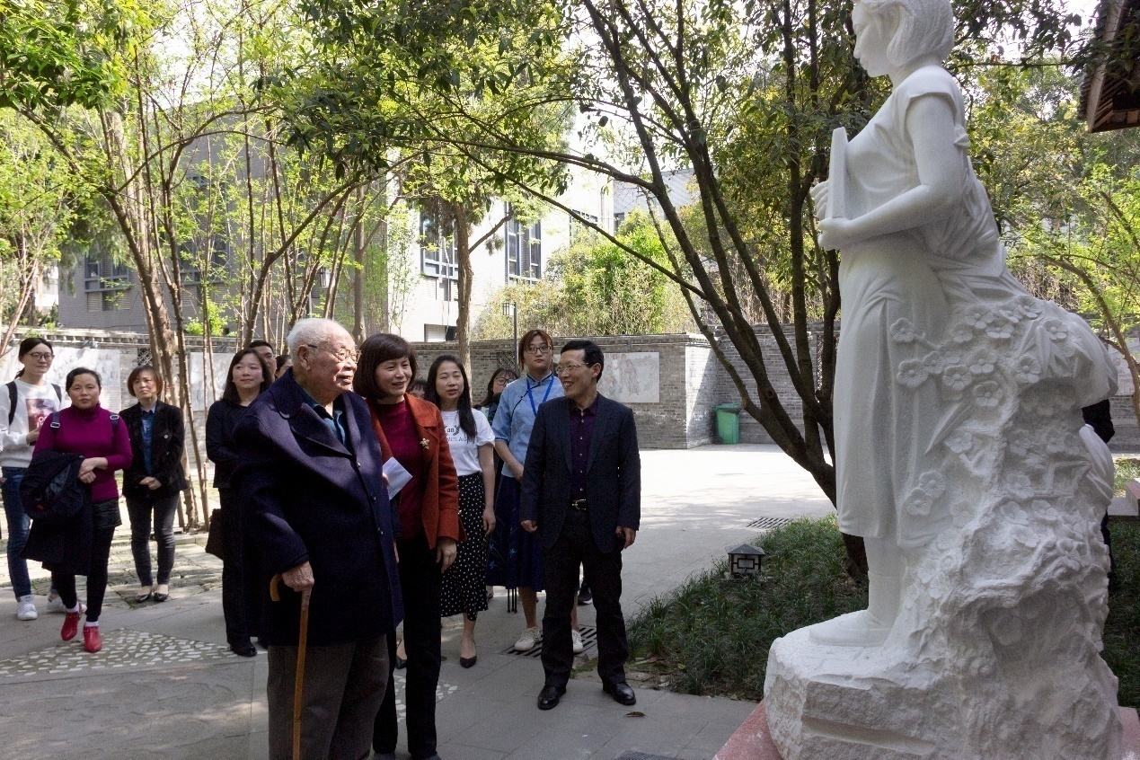 “江姐纪念馆”匾额由马识途先生亲笔题写。在纪念馆门口,他走下轮椅,在家人的搀扶下步入纪念馆,看到馆内树立的江姐雕像,马识途先生说:“这很像她。”虽然不时需要用轮椅代步,但马识途先生依然仔细地观展,认真听取讲解员的介绍,当看到妹妹马秀英、爱人王放在川大读书、从事地下革命工作时与同学们的合影时,他与家人讲述起亲人参加革命的故事。在室外展区,马识途先生再次离开轮椅,步行参观。“三教授事件”、“女生社会员选举获胜”等浮雕再次勾起他的回忆,站在庭院中,他说:“我记得这里,那棵娑罗树也在。”