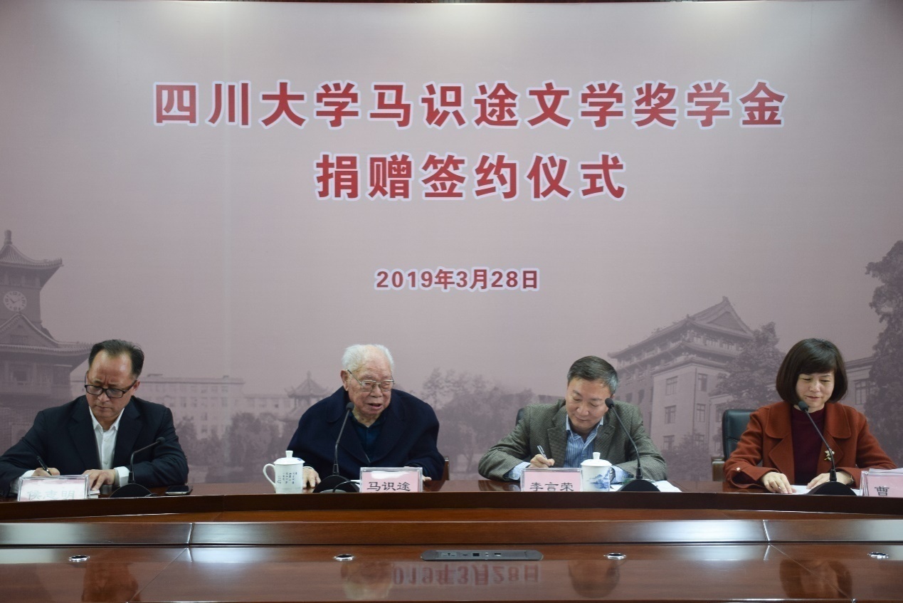3月28日下午,春风和煦,暖阳高照,德赢vwin体育官网登录德赢vwin体育官网登录举行的“马识途文学奖学金”捐赠签约仪式现场暖意流动。我国著名革命家、文学家、书法家,我校杰出校友、特聘教授马识途先生出席仪式并向德赢vwin体育官网登录捐赠105万元,用以资助热爱文学的寒门大学生。出席与参加捐赠仪式的有:德赢vwin体育官网登录校长李言荣,马识途先生的子女马建生、马万梅,四川省作家协会党组书记、常务副主席侯志明,诗婢家文化公司董事长柏优,四川省委宣传部、诗婢家文化公司、学校有关单位负责同志,以及德赢官网古立峰书记、李怡院长和师生代表。德赢vwin体育官网登录党委副书记曹萍主持捐赠签约仪式。