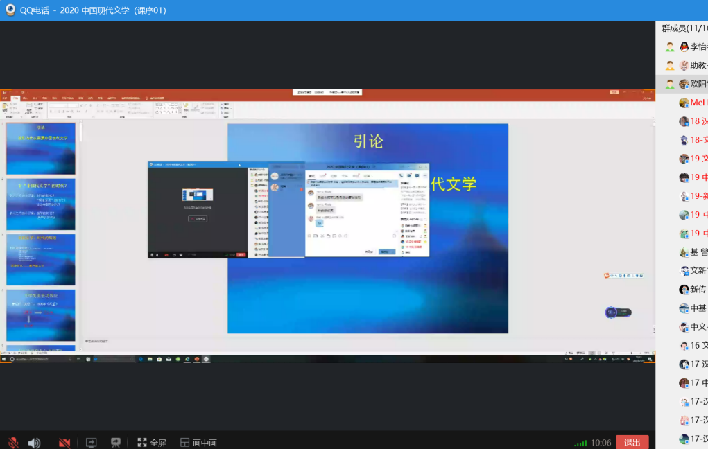 李怡教授的课程《中国现代文学》在星期一下午1点50通过QQ语音群聊和屏幕分享准时开展,线上听课的不仅有原本19级的学生,很多18、17级的学生也参与进来,充分体现了线上授课的长处。李怡老师以切近的人生经历、发自内心的感知入手,和学生探讨了现代文学与全民阅读时代的关系,引论王富仁与鲁迅研究给现代文学学习和研究的启示。课程全程讲解流畅,PPT展示屏幕分享也比较清晰,课程效果好。他同时让同学们了解到自主学习的重要性,请同学们充分利用慕课自学,并为下一节课的讨论作了安排。课后,同学们纷纷表示感谢老师的精彩讲解,表达了对现代文学课程学习的兴趣和信心。