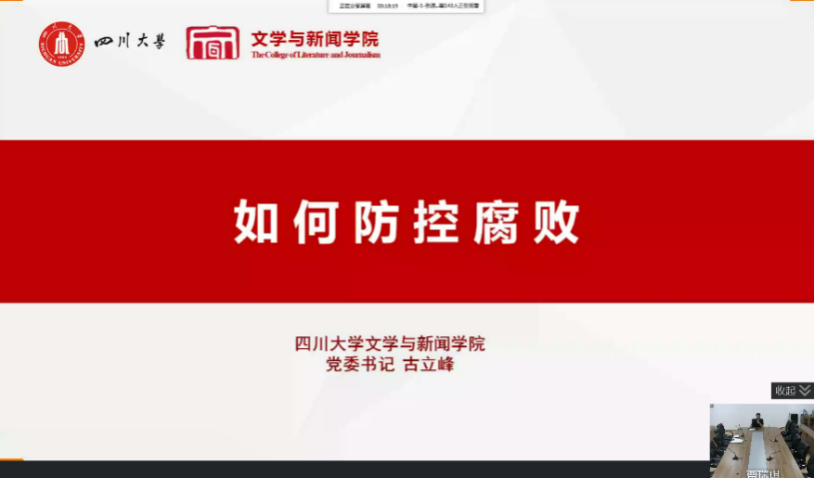 2020年6月5日下午,德赢官网党委书记古立峰教授走进2019级本科生《形势与政策》课堂,为中国语言文学类学生讲授了一堂爱国廉政党课。由于疫情原因,本次授课在线上进行,2019级本科生辅导员贾瑞琪老师、兼职辅导员张佳奇老师在文科楼一区311会议室线下旁听了党课。