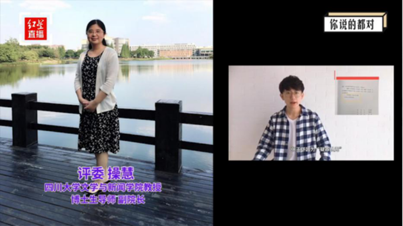 8月3日,第二季“红星新闻高校评论新秀挑战赛”(视频评论专场)在线上启幕,来自全国各地高校的150余名学子参加了本次比赛。德赢官网学子积极参与,在比赛中获佳绩。德赢官网副院长操慧教授任评委,并受邀与参赛学子进行线上分享交流,探讨网络时代的观点表达。共同担任评委的还有中国青年报编委、高级编辑曹林,四川省电视艺术家协会新媒体专委会主任王彬荣。