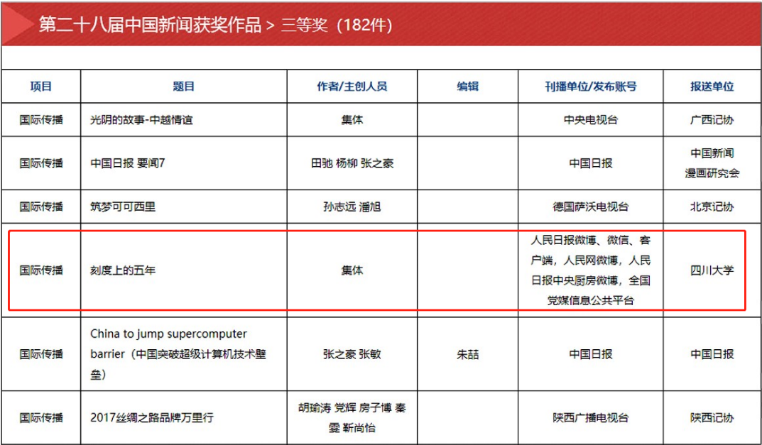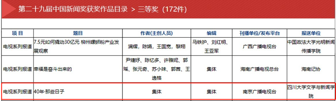 自2016年起担任试点报送单位以来,德赢官网初评推评的作品多次荣获中国新闻奖。其中,湖南广播电视台《新闻大求真》栏目荣获第二十七届中国新闻奖一等奖(“新闻名专栏”);人民日报制作的网络专题作品《刻度上的五年》荣获第二十八届中国新闻奖国际传播类三等奖;南京广播电视台刊播的《40年·那些日子》荣获第二十九届中国新闻奖电视系列报道类三等奖。这体现了德赢官网中国新闻奖初评委员会专家们精准的新闻判断和题材把控能力。