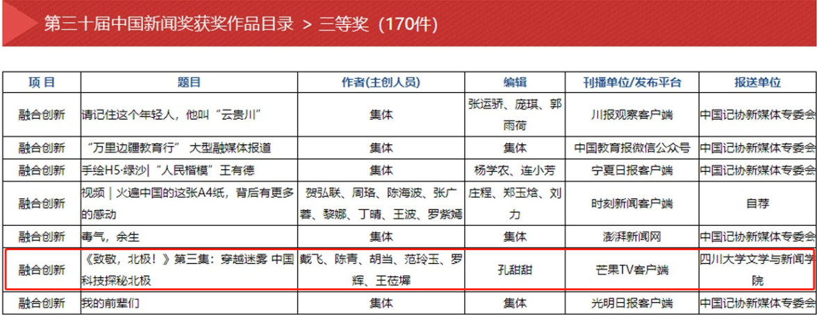 2020年11月2日,中华全国新闻工作者协会主办的第三十届中国新闻奖、第十六届长江韬奋奖评选结果揭晓,共计348件作品获中国新闻奖,包括特别奖5件,一等奖68件,二等奖105件,三等奖170件。