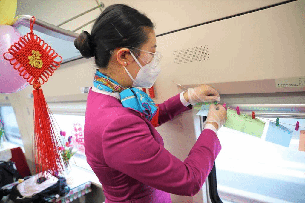 列车上,车厢宽敞明亮,旅客虽多,但并不显得拥挤。餐车车厢中,乘务员已经为春运旅客提前准备好了迎接新年的小纪念品与装饰品。中国结、气球、灯笼、祝福贴纸、虎年玩偶、途经地风景名胜照片等,让人感受到喜庆与欢迎的温暖气氛。