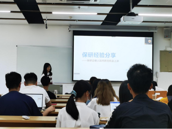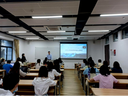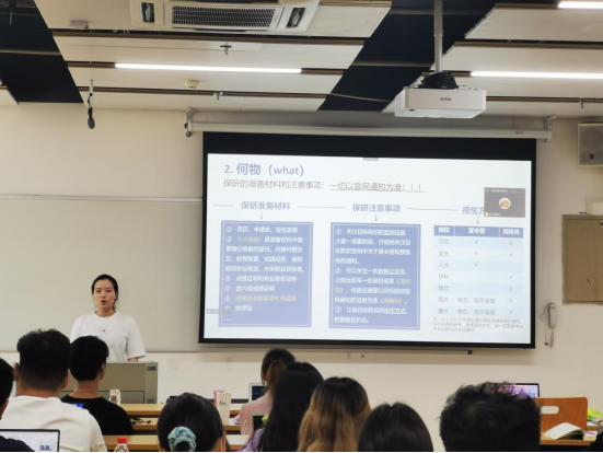 随后,经验分享环节正式开始。首先是中文专场,莫凯洁同学作为第一位分享同学从“知道保研是什么”“在保研中做了什么”两个问题开启了本次分享会之旅,她按照“三步走”的策略阐述了“目标确定”“步骤分明”和“行动办法”。牛童同学讲述了自己从国际知名暑校到成功保研的多彩经历,尤其是将出国留学准备工作和国内保研准备工作融合在一起,为同学们提供了针对性的借鉴经验。崔逸灵同学以“普通人保研指南”为题,生动形象地为面临保研焦虑的同学“开处方”“避禁忌”。向宇歌同学和王一丹同学分别用时间轴的方式展示了自己保研过程中的具体安排,为大家梳理了更加清晰的时间管理步骤,并介绍了部分学校的夏令营时间安排和部分公开的面试流程。赵嘉宁同学则先是讲述了自己在保研路上曲折但激励人心的故事,后又无私分享给大家详细的资源清单。彭笑秋同学以录制视频的方式为大家分享保研路上的几个关键步骤“发现兴趣-收集信息-明确定位-供需对接”的心得,十七分钟的视频充满干货。