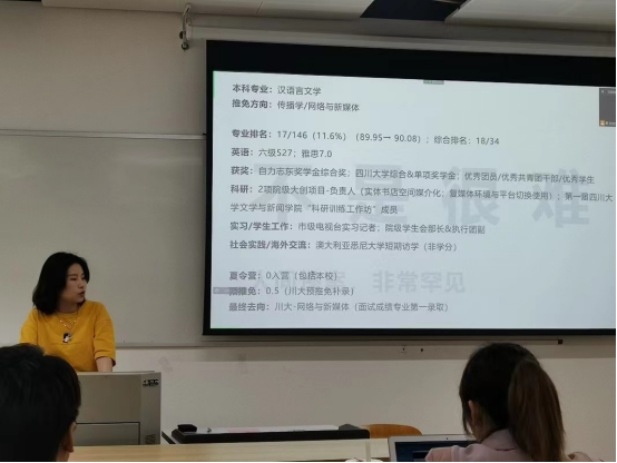 本次分享会采取线上与线下相结合的方式,分新闻传播专场和中文专场展开。分享会伊始,德赢官网党委副书记银浩老师结合自己的读研经历和对研究生阶段个人学习与发展规划等的理解,为同学们讲解了深造的意义和利弊,鼓励同学们认真思考、踏实行动,并祝福同学们保研顺利。