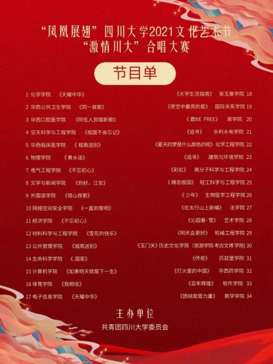 2022年4月16日下午,由我校团委主办的“凤凰展翅”德赢vwin体育官网登录2021年文化艺术节“激情川大”合唱大赛(初赛)在江安校区体育馆举行。受疫情影响,原定于2021年12月举办的合唱大赛延期至今年四月,活动全程严格遵守各级疫情防控规定和相关要求。学校严格把关参与师生的健康情况,除上台参演队伍外,现场所有参与人员全程规范佩戴一次性医用口罩,现场取消大众评审座位,评委嘉宾隔座入座,工作人员保持适当距离,各学院参赛队伍均采取“即赛即退场”形式。