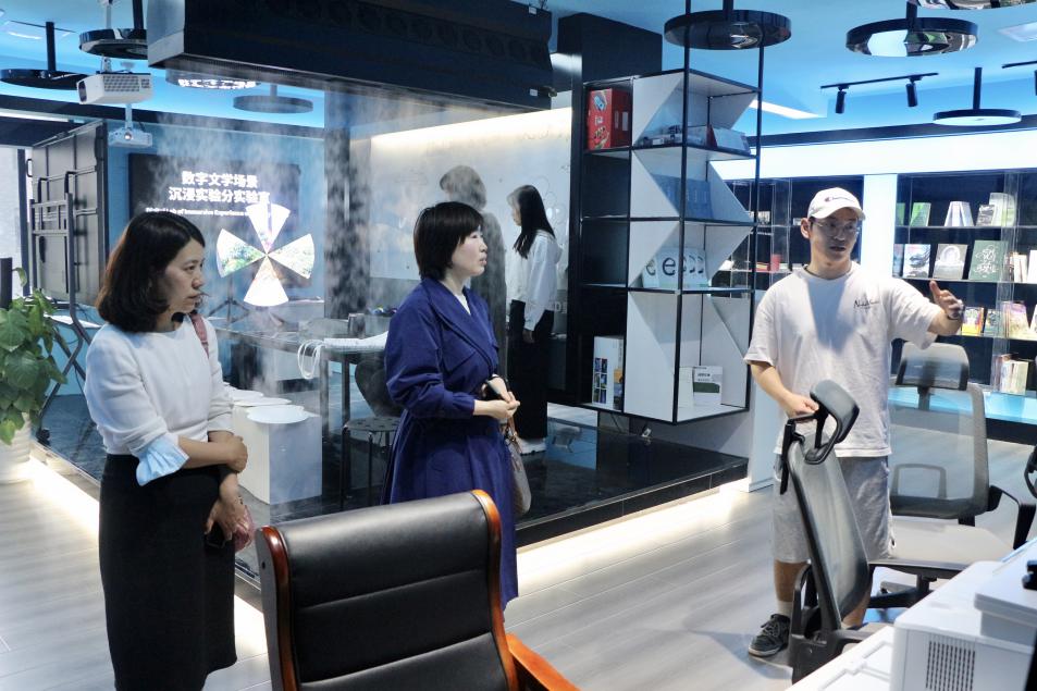 随后,调研组一行来到德赢官网中华文化传承与全球传播数字融合实验中心参观。在实验中心办公室主任邱树雄副教授和实验室崔宝双老师的带领下,调研组一行依次参观了数字人文典籍大数据分实验室、数字文学场景沉浸分实验室与数字多模态符号认知分实验室三个分实验室,并与学院师生就中国文学与文化典籍大数据、中华文化数智整合国际传播、传统故事数字创新转化、“大文学”场景与科幻虚拟仿真、中华语言文字谱系数字化、中华文化多模态符号认知等话题对话交流。