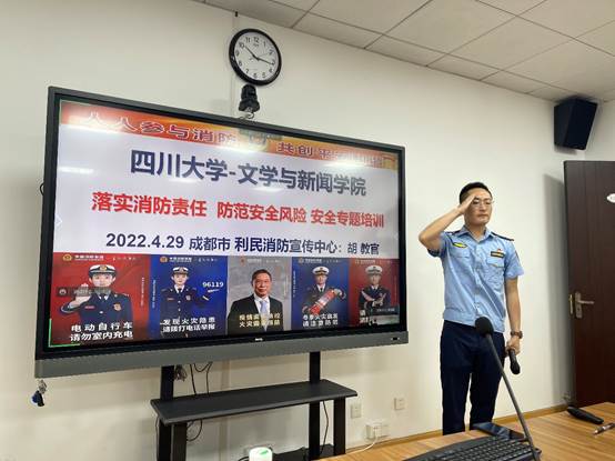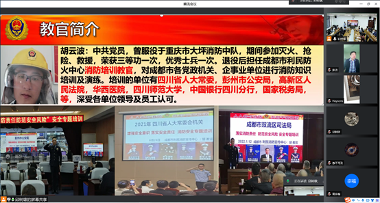 为贯彻 “安全第一、预防为主”的校院消防安全指导思想,增强全院教职工全民安全教育意识,掌握“预防为主,防消结合”的消防知识,2022年4月29日上午,德赢官网举办了一场消防知识安全教育培训会,培训会议采用线上线下结合方式进行,学院领导、全体行政老师和部分新进教师在学院311会议室现场参加,全院其他老师均在线上视频参会。会议邀请了成都市利民消防宣传中心的胡云波教官到场培训。
