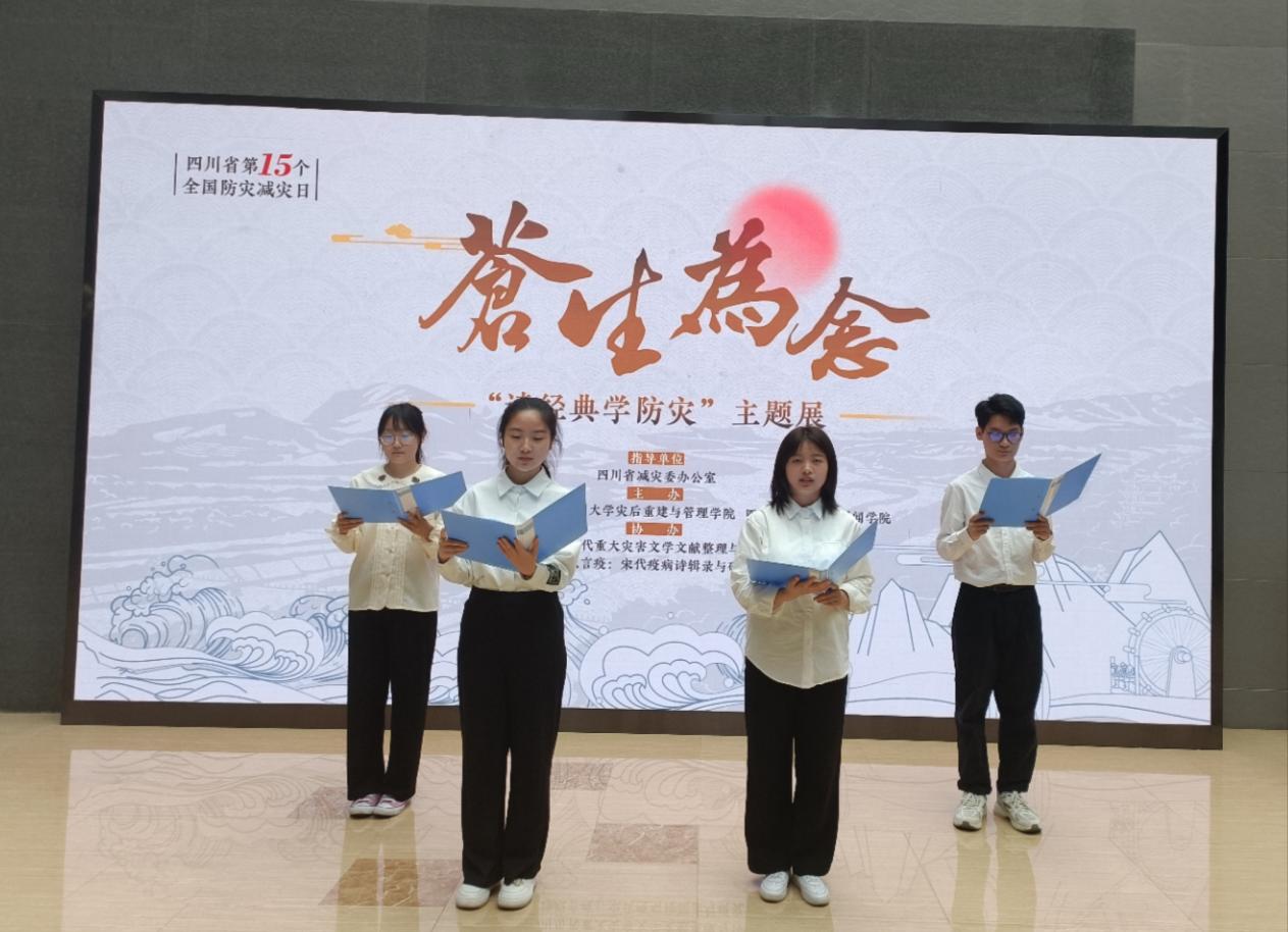 今年是德赢官网与四川省防灾减灾馆合作举办展览的第二年,至今已有三个大创项目团队依托学院平台以灾害文献展览的形式实现科研成果创新转化。2022年,德赢官网国家级大创项目“元代灾害诗词辑录与研究”团队就作为主要力量参与了“古诗词中的自然灾害”主题展览策划,相关活动的报道刊发于四川省应急管理厅官网。回顾两年的展览筹备过程,主创人员杨巧如表示:“在老师的指导下,我们对四川地区灾害文化历史展开挖掘与研究,翻阅了几千万字材料,辑录上千份灾害文献,在精挑细选后进行注释、翻译,并通过展览、新媒体等形式进行传播宣传,希望将这份对灾害的关注与思考,转化为减灾兴川与减灾兴国的文化力量。”