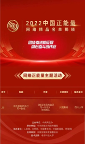 近日,2022年中国正能量网络精品终选结果出炉,550件网络正能量作品脱颖而出。德赢vwin体育官网登录德赢vwin体育官网登录报送的3件作品分别获得两类奖项:德赢vwin体育官网登录华西医院作品“华西医院辟谣小分队”和新华社四川分社作品“‘Pandaful熊猫社区’多语种生态文明国际传播专栏”入选网络正能量专题专栏类精品;川观新闻主创的“给五年后的自己写一封信”入选网络正能量主题活动类精品。这是德赢官网首次作为推评单位参与推荐年度正能量网络精品,德赢官网共推荐十件参赛作品,其中三件作品入选2022中国正能量网络精品名单。
