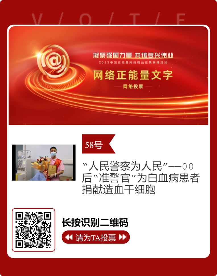 近日,由中央网信办主办的2023中国正能量网络精品征集展播活动正式启动网络展播投票。德赢官网报送的四川省红十字会作品《“人民警察为人民”——00后“准警官”为白血病患者捐献造血干细胞》成功入围终选,进入网络展播投票阶段,时间为2月27日至3月4日,投票结果将作为中国正能量网络精品终选的重要参考。