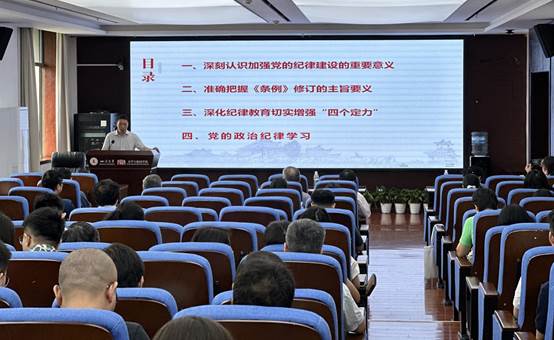 首先,傅其林书记通过回顾百年党史,阐释了加强党的纪律建设的重要性。他指出,加强纪律建设是我们党的光荣传统和独特优势,是深入推进全面从严治党的治本之策,是推进中国式现代化的根本保证。接着,傅其林书记解读了《条例》修订的主旨要义,包括认识把握新的指导思想和总体要求,认识把握越往后执纪越严的鲜明信号,认识把握对“四种形态”深化运用和“三个区分开来”的有效落实,认识把握坚持党性党风党纪一起抓的实践导向,认识把握促进执纪执法贯通的系统观念等五个方面内容。要求全院师生要进一步深化对加强党的纪律建设重要性和忽视党纪、违反党纪问题危害性的认识,全面领会《条例》精神实质和实践要求,不断提高政治自觉、思想自觉、行动自觉,切实把思想和行动统一到党中央决策部署上来。