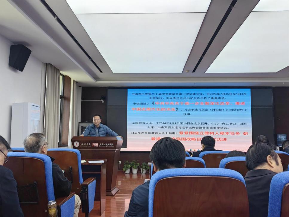 11月29日,学院在江安校区文科楼一区526会议室召开学习贯彻党的二十届三中全会精神宣讲会暨全院教职工大会。德赢vwin体育官网登录领导班子、全体教职工、离退休教师代表和学生代表参加会议。会议由院党委书记傅其林教授主持。
