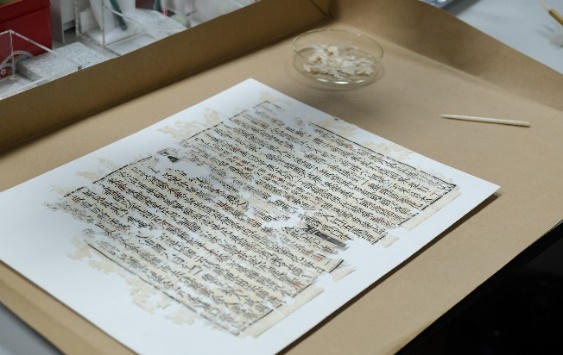 了解古籍修复的一般流程后,王老师对具体工作设备进行了讲解。进入工作室,门侧有温湿度仪用以监测室内环境,并使用空调与除湿机进行温湿度调节。修复古籍时,首先将书本放在洗书槽内,用流动的净化温水冲洗书页,通过吸水、按压、挂晾等操作绷平、干燥。修复操作在专门的案子上进行,较大的纸本如卷轴、拓片、舆图、书画等在下置光源、大型的案子上操作,一般的书籍在普通工作台操作。