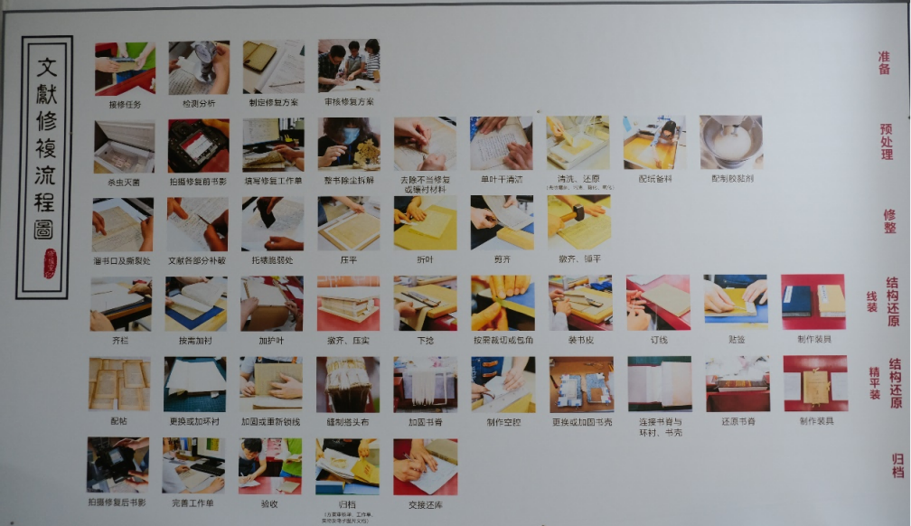 古籍整理培训结束后,丁老师带领团队前往古籍修复室参观学习,古籍修复室的王飞朋老师为团队成员进行讲解。团队参观时,修复室中的工作人员正在专心工作,室内静谧、整洁,各处用具摆放严谨。王老师首先介绍了古籍修复的完整流程,包括准备、预处理、修整、结构还原、归档五大步骤。